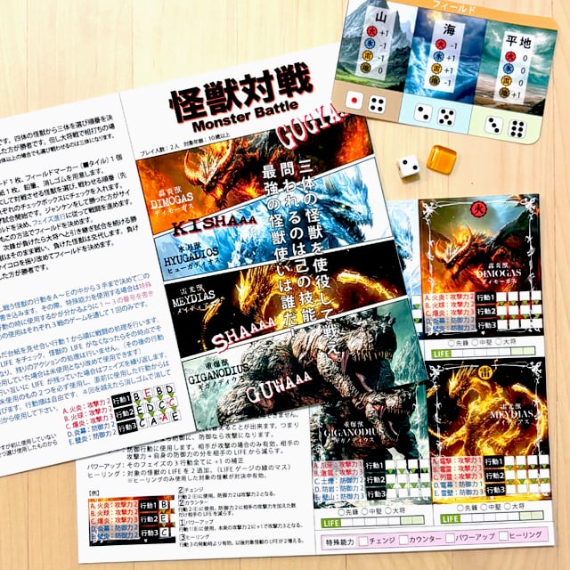 基本はワンセット2枚で二人対戦の怪獣団体戦ゲームです。プレイヤーは怪獣使いとなり監督のように怪獣の戦う順番を決め、戦うときにはその行動を決めます。ほぼ同じ戦力の中、怪獣の相性、行動の読み合い、特殊能力のタイミングが闘いを左右します。対戦カードゲームのような駆け引きを紙ペンでお楽しみ下さい。
