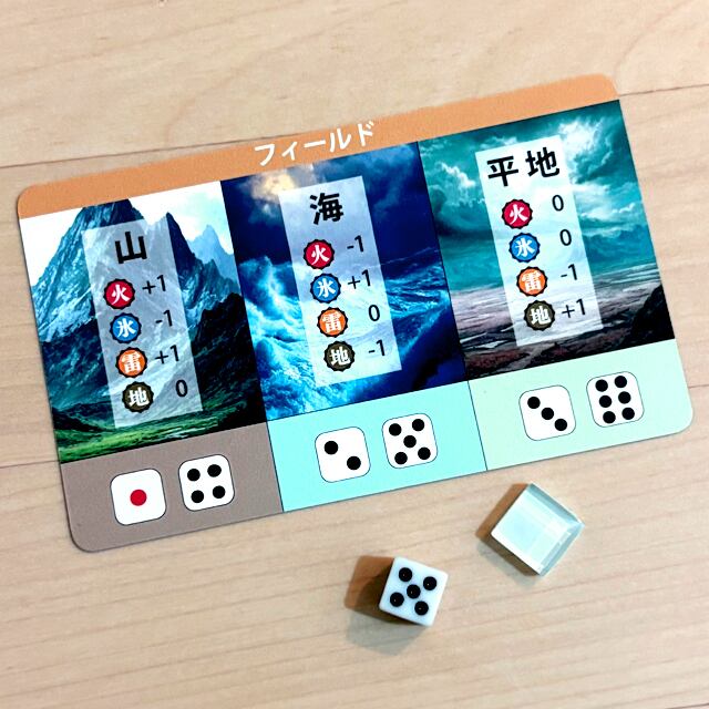 ゲーム台紙2枚、フィールドカード1枚、フィールドマーカー1個、サイコロ1個
