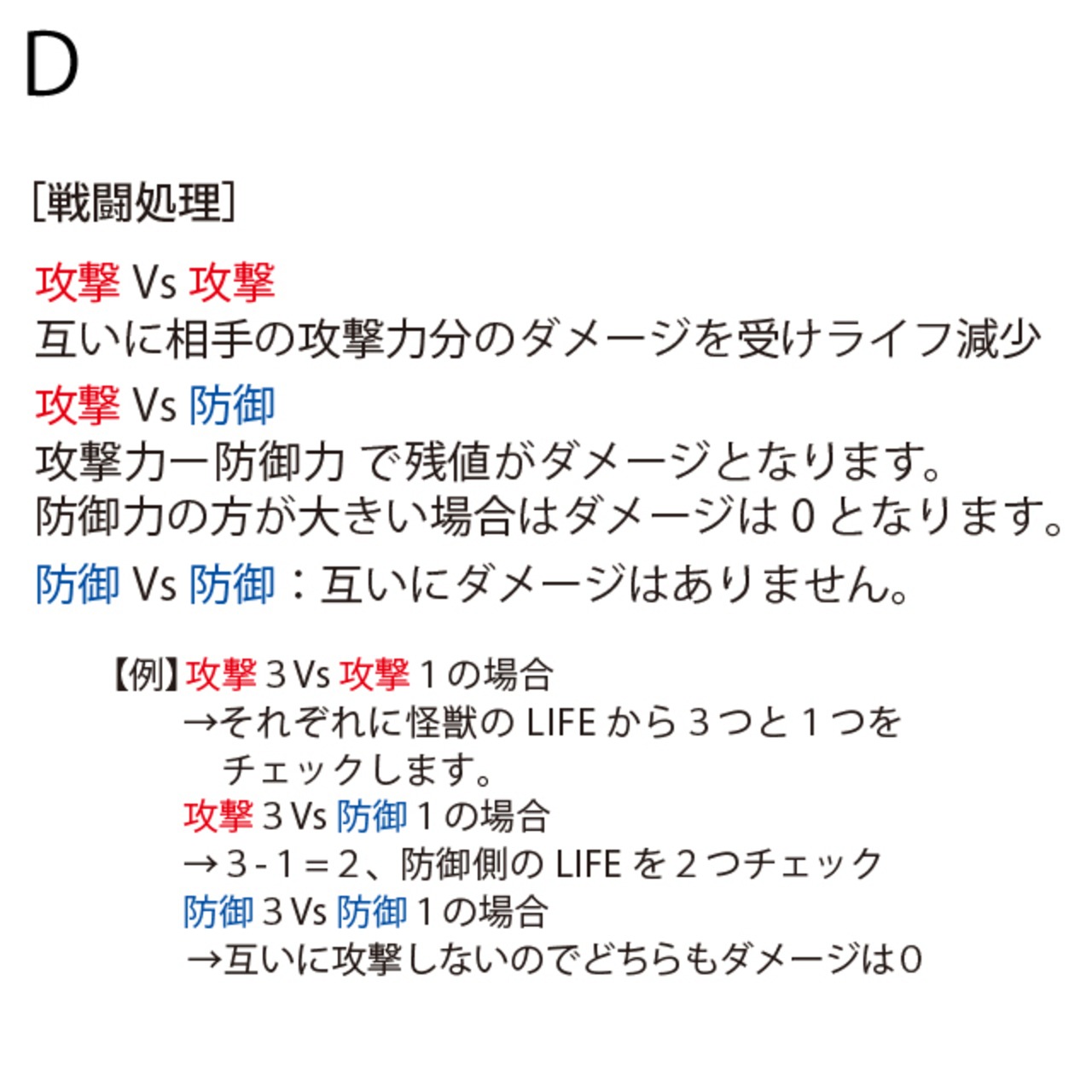 行動を書き込んだ台紙を見せ合い行動1から順に戦闘の処理を行います。(写真D)結果に従い順次LIFEをチェック。怪獣のLIFEがなくなったらその時点でその怪獣は負けとなり、残りのアクションの処理は行いません。(その後の行動に特殊能力を使用していた場合は未使用となり改めて使用できます)