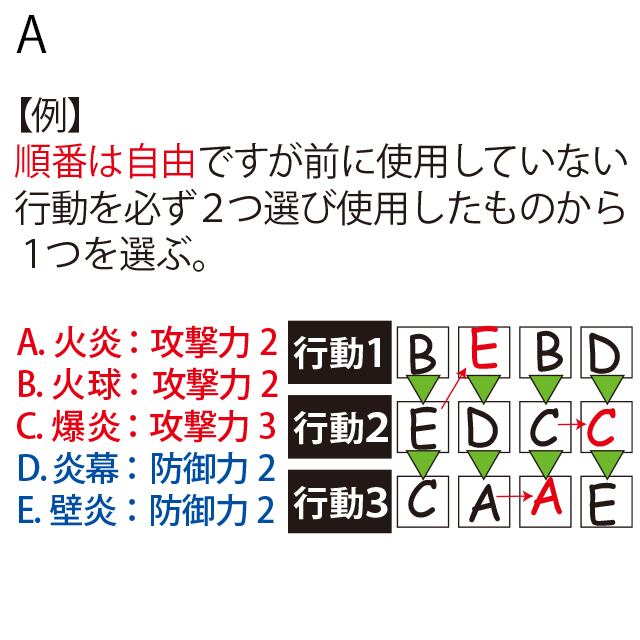 行動3まで行い互いにLIFEが残っていた場合はフェイズを繰り返します。ただし行動は未使用のもの2つを必ず使用し、直前に使用した行動からは1つだけを選びます。4回を越えたら消しゴムで消してまた最初の列から使用して下さい。