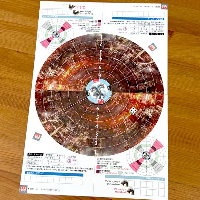 怪獣は衝撃波と熱線で攻撃してきます。衝撃波の攻撃範囲は怪獣回転フェイズの出目の同心円です。そしてその数がダメージとなります。