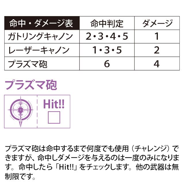 【プラズマ砲】は各プレイヤー1発のみ命中させダメージを与えられます。何度でも使用(チャレンジ)する事が出来ますが一度命中しダメージを与えるとプラズマエネルギーを全消費し以後使用出来ません。命中したら「Hit!!」をチェックします。他の武器は無制限です。