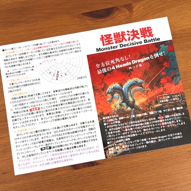 部隊で協力して四つ首龍を倒せ。最強の四つ首龍、四つの首に死角は無い。攻撃は防がれ、熱線に衝撃波が四方へと放たれる。それをかいくぐりガトリングキャノン、レーザーキャノン、それにプラズマ砲と三種の武器を駆使し、四つの首を破壊して倒せ。互いの連携とサイコロの目、そしてプラズマキャノン、自身の判断が運命を分ける。サイコロ運の要素が強いゲームですが、怪獣との闘いは未知なもの。その理不尽さを体感し、楽しんで頂ければと思います。