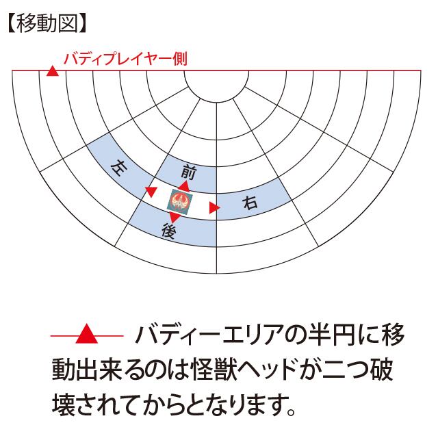 両プレイヤーは部隊マーカーが接している前後左右の同心円マスに1マス移動出来ます(移動しなくても可)。また移動は基本的に自身側の台紙半円内となりますが四つ首のうち怪獣ヘッドが二つ破壊されればバディプレイヤー側の半円にも移動可能となります。【移動図参照】