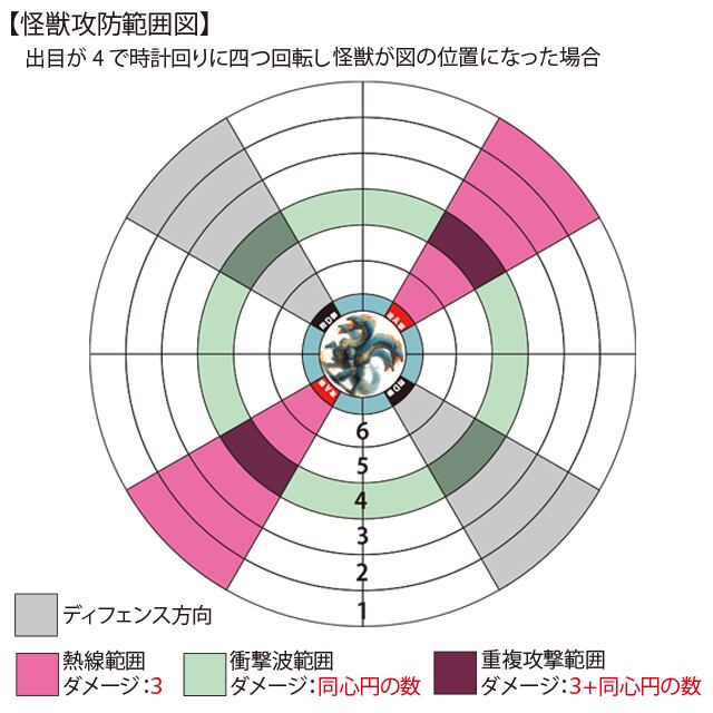 つまり怪獣が4つ時計回りに回転した場合、4の同心円が攻撃の対象となり、そこに部隊がいれば4ダメージとなります。【怪獣攻防範囲図】参照